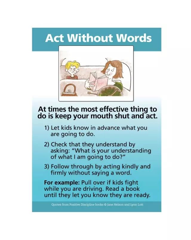 在管教孩子的过程中,不要总是使用语言,有时无言的行动也很重要。当你不得不说时,话越少越好。你让孩子参与解决问题时,如果制定的计划中包括一些无言的信号,以帮助大人们学会闭上自己的嘴巴,就会更有效。